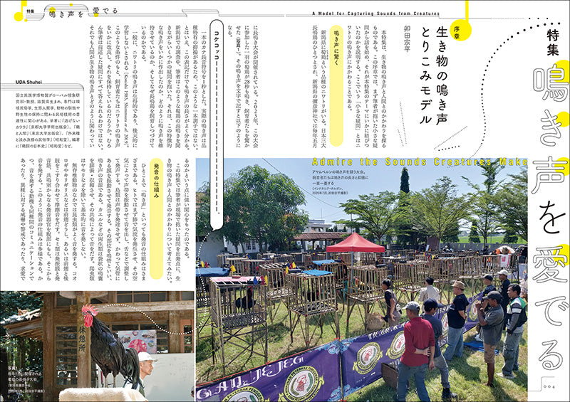 一般に、ニワトリの鳴き声は生得的であり、後天的に学習しないとされる。では、飼育者たちはニワトリの鳴き声をいかに改良し、それを保持しているのだろうか。この特集では筆者が現場で抱いた疑問を出発点に、生き物の鳴き声と人間とのかかわりについて考える。