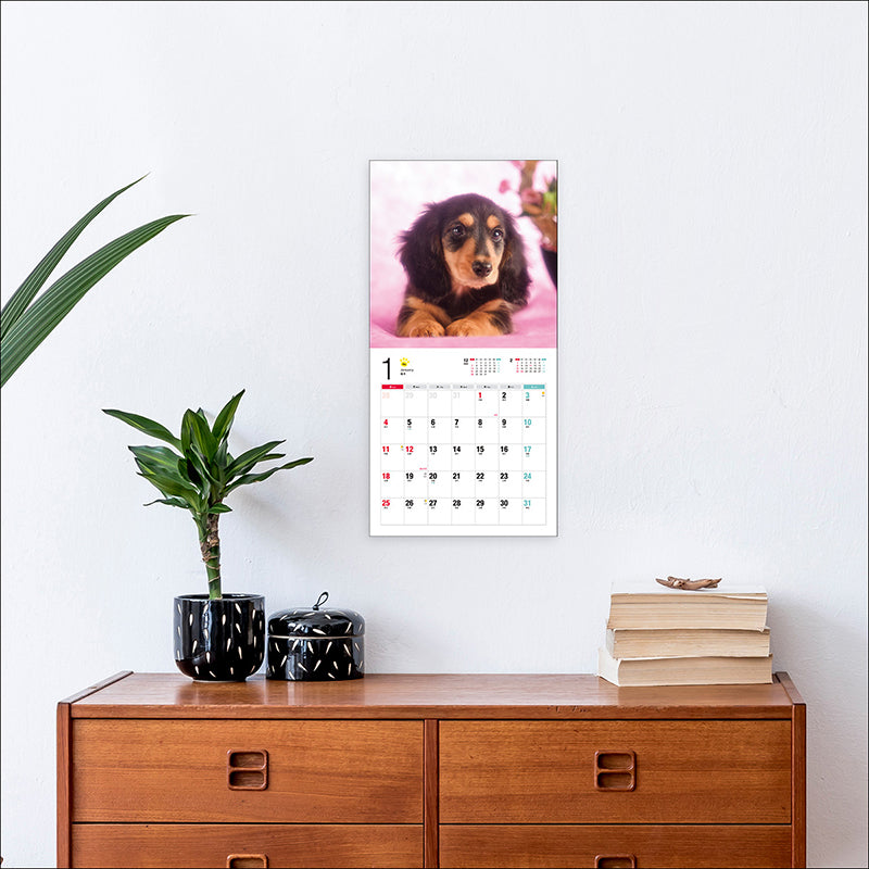 A large monthly calendar featuring miniature dachshunds. Photographed by Toshihiko Ikawa, who is renowned for his lively animal photography.