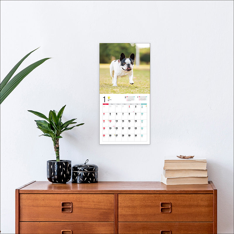 A large monthly calendar featuring French bulldogs. Photographed by Yoko Nakamura, who is renowned for her lively animal photography.