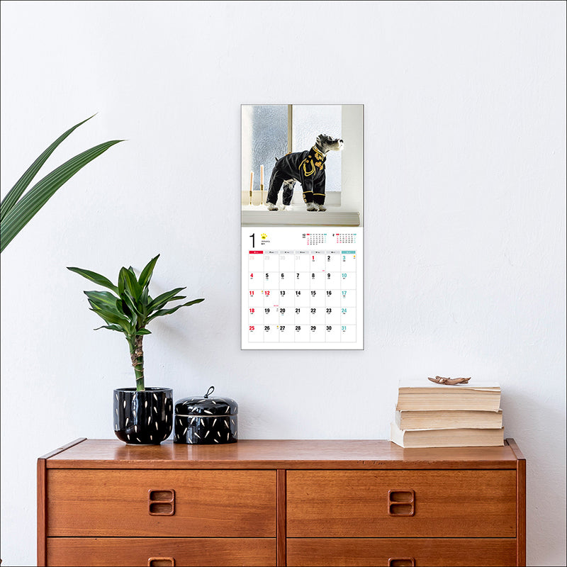 A large monthly calendar featuring miniature schnauzers. Photographed by Yoko Nakamura, who is renowned for her lively animal photography.