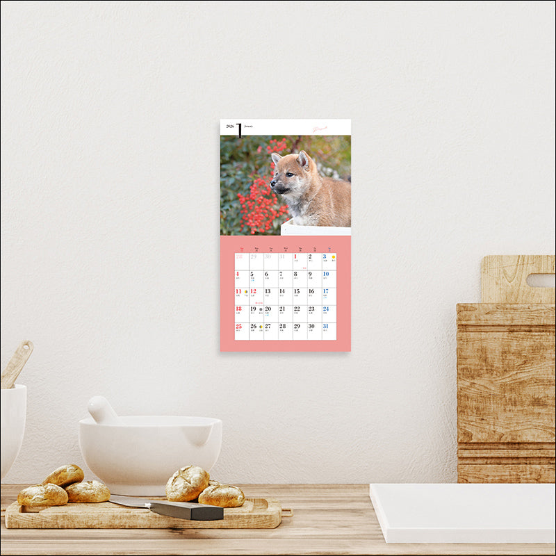 A mini monthly calendar featuring Shiba Inu dogs. Photographed by Toshihiko Ikawa, who is renowned for his lively animal photography.