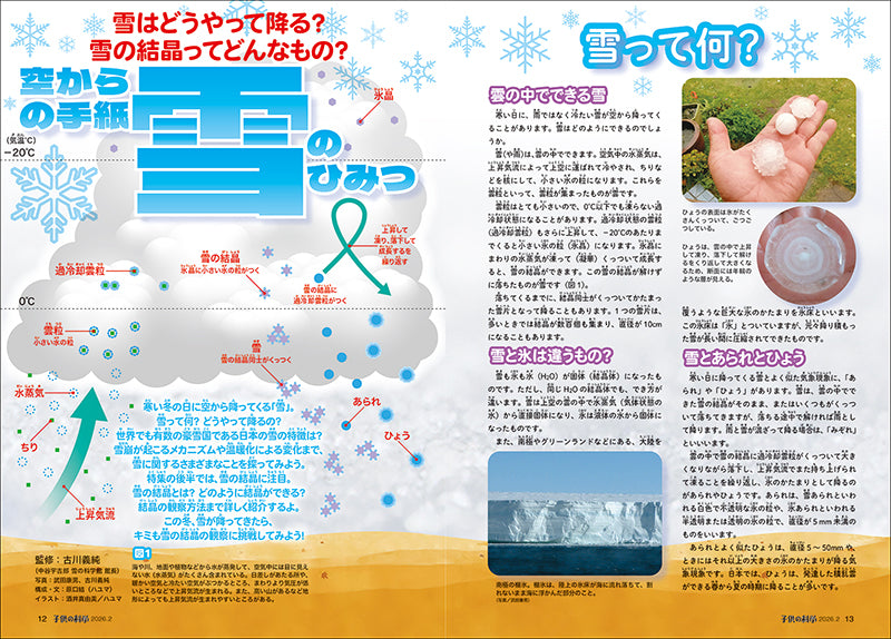 寒い冬の日に降ってくる雪。実は日本は世界でも有数の降雪地帯なのは知っていましたか? この特集では、雪の謎について迫ります。そもそも、どうして雪が降るの? 氷とは違うの?といった疑問から、粉雪とぼたん雪の違い、雪崩が起きるメカニズムの疑問に答えます。後半ではきれいな雪の結晶を紹介。みなさんも観察できる方法も解説します。雪が降ったらぜひチャレンジしてみてください!