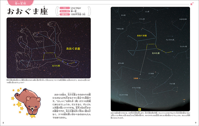 星座案内のページでは、美しい写真とイラストでやさしく紹介。夜空で星座を見つけられるようになります。